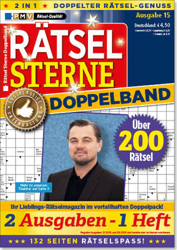 Jetzt auch als Doppelband: Rätsel Sterne verleiht dem Rätselhimmel ganz besonderen Sternenglanz: Über 125 Rätsel auf 66 Seiten, ein redaktioneller Spannungsbogen aus Bewährtem und Innovativem sind Garanten für vollkommenen Ratespaß.